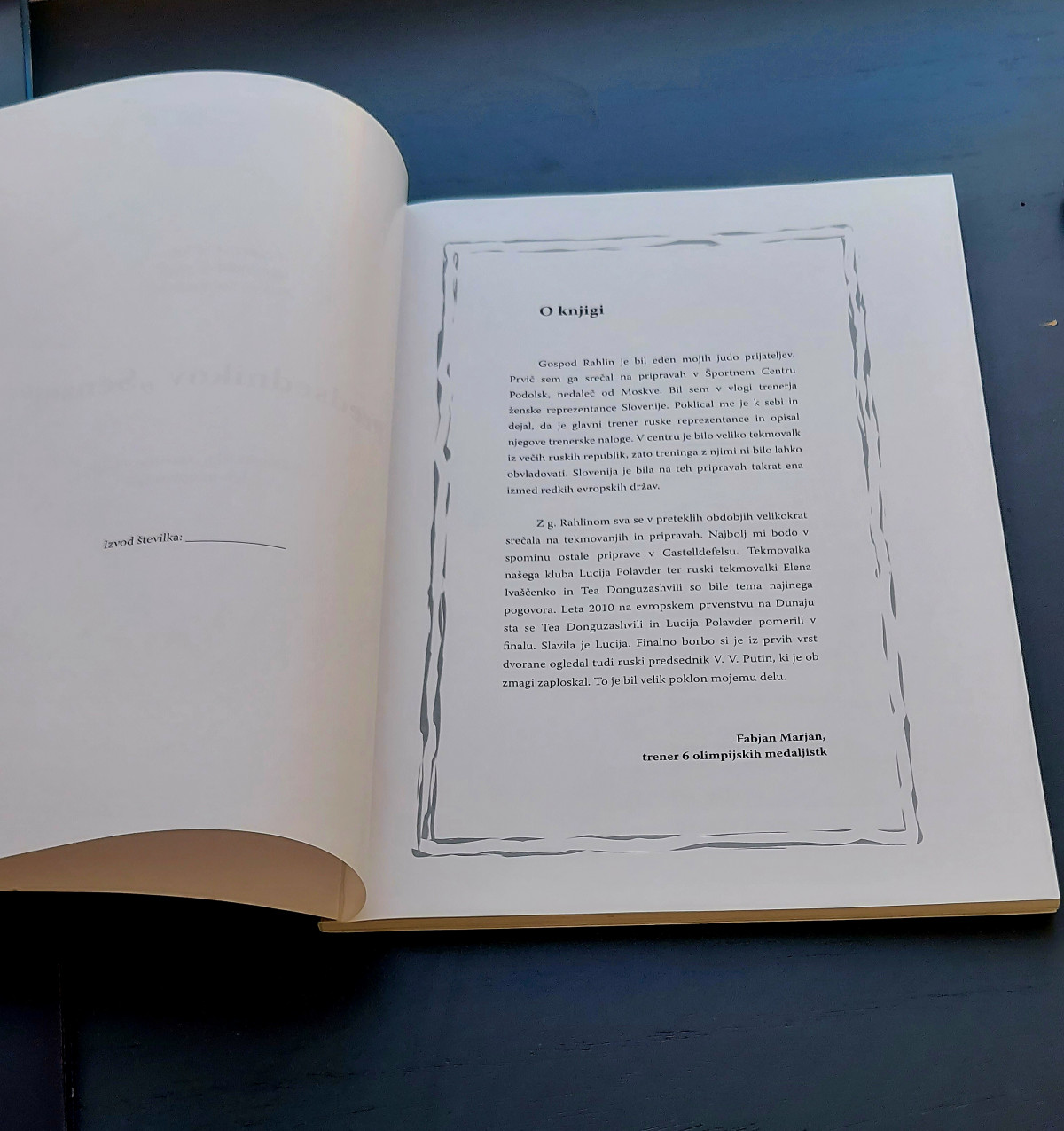 Издателем словенской версии «Predsednikov “Sensej”» выступил клуб дзюдо «Z’dežele» Sankaku из города Целе, в котором уже не одно десятилетие работает г-н Фабьян. Сам он написал к книге вступительное слово, в котором вспоминает о первой встрече с Анатолием Рахлиным на сборах в подмосковном Подольске. Затем были еще встречи и общение с Анатолием Соломоновичем и его «подопечными» спортсменками. Вспомнил и о том, как в 2010 году на чемпионате Европы их воспитанницы - Теа Донгузашвили и Люция Полавдер - встретились в финале. Тогда чемпионкой континента стала словенка.