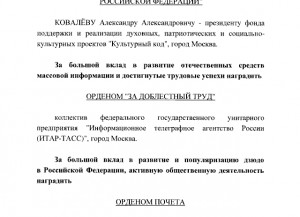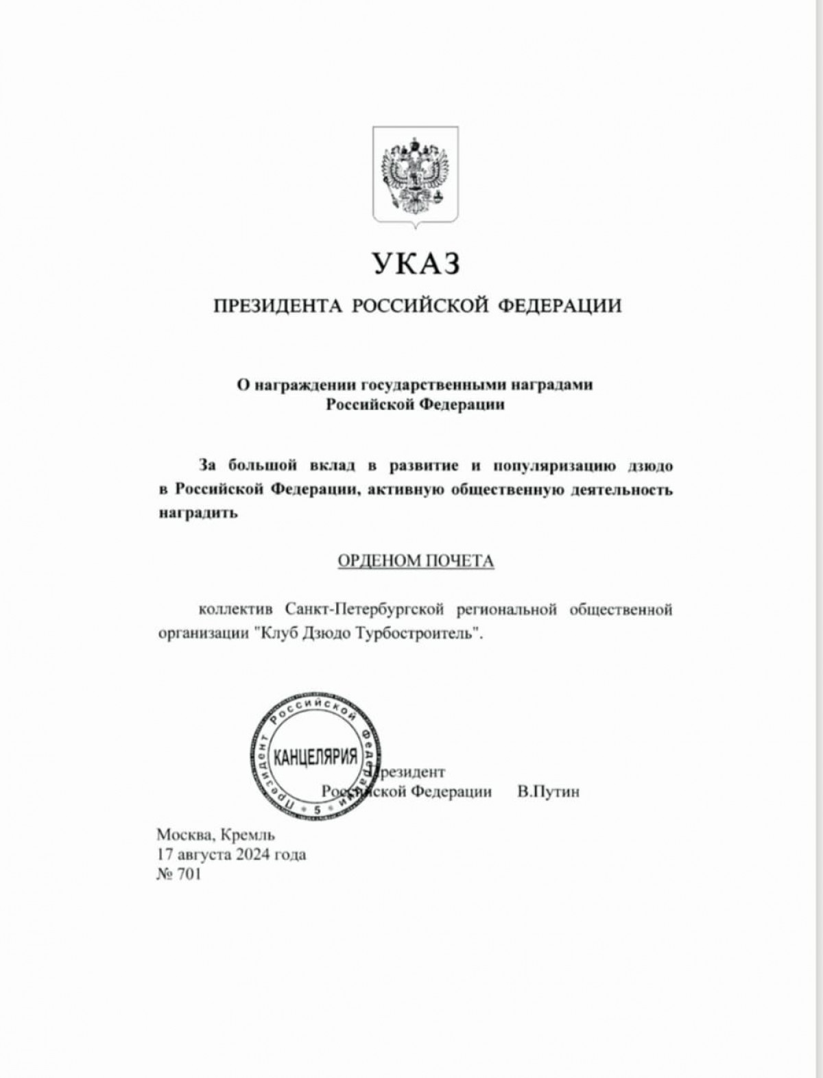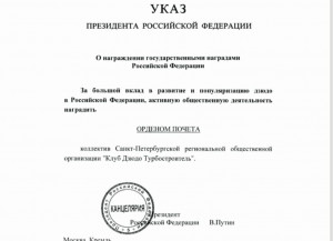 Указом Президента Российской Федерации от 17.08.2024 № 701 "О награждении государственными наградами Российской Федерации" коллективу "Клуба Дзюдо Турбостроитель" присвоена государственная награда - оден Почета за большой вклад в развитие и популяризацию дзюдо в Российской Федерации, а также активную общественную деятельность.