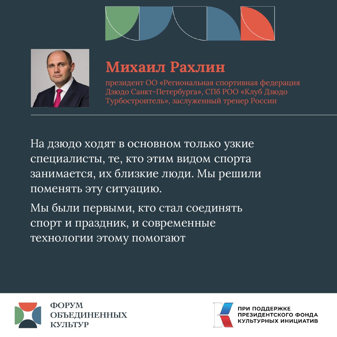 Площадка, посвященная физической культуре и спорту, в рамках форума прошла впервые и привлекла большое внимание со стороны как гостей, так и прессы. Известные деятели культуры и спорта поговорили о синергии спортивных дисциплин и искусства, использовании современных технологий в тренировочном процессе и соревнованиях. По словам Михаила Рахлина, это все успешно практикуется его командой уже не один год. "В формат спортивного праздника мы включаем торжественное открытие, спектакли, мы рассказываем о выдающихся людях, говорим об их жизненном пути, как они достигли каких-то высот. Мы говорим об истории и культурных событиях», – сообщил глава Федерации дзюдо Петербурга.