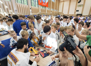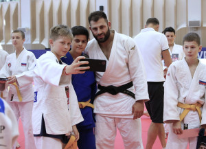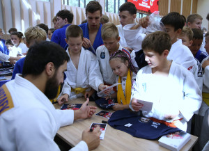 Судя по улыбкам и позитивной, дружеской атмосфере, царившей с утра в зале, довольны остались все участники тренировки! Но, как нам показалось, особенно счастливы были ее младшие участники! Что, впрочем, не удивительно: не каждому выпадает возможность лично встать в спарринг с олимпийским чемпионом! Сегодня такой шанс был и у младших ребят из отделения дзюдо школы, и у членов мужской сборной команды города, за работой которых внимательно наблюдали их наставники - старший тренер Евгений Станев и Данил Волович. Футболка с портретом Хасана Халмурзаева, открытка с его автографом и фото на память со знаменитыми чемпионами - без подарка никто не остался!
